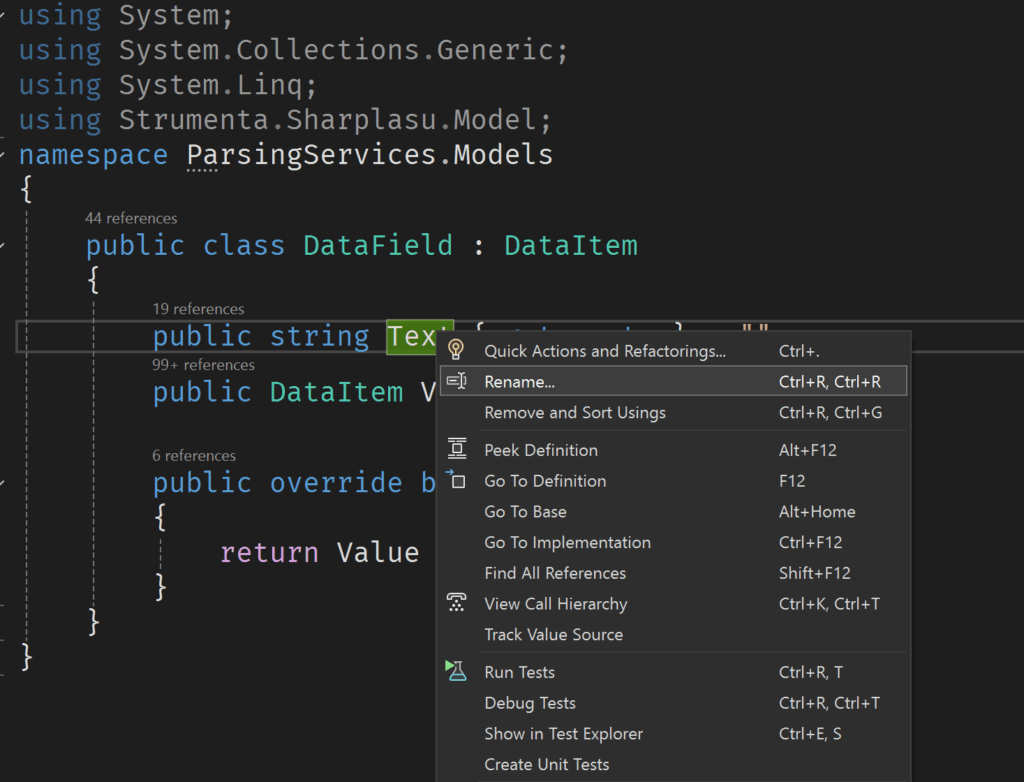 It’s quick, reliable and it works. All you need is the ability to parse the code and resolve symbols. We need to resolve symbols because we don’t want to change the name of elements with the same name or references to other elements with that same name. For instance, in this example we want to change the name of the variable text of the constructor, but not the one of the same name of the class.
