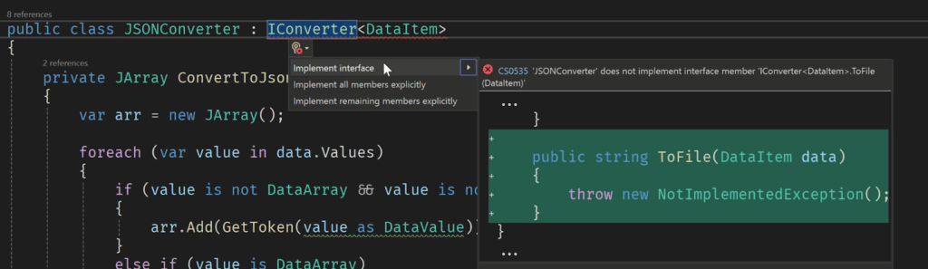 In this short videos I use Cursor to generate implementations for two methods of the interface: ToFile and FromFile. The interface is a generic way to create DataItem objects, i.e., the internal representation of data in this program, and an output file.