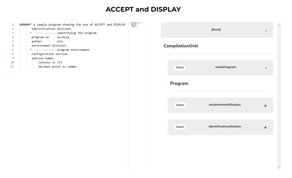 We have set up a platform to allow testing the COBOL parser online, without the need to install anything. You can see what an AST looks like. You can test our COBOL parser, or any of our other parsers for that matter, with some example files on our playground.