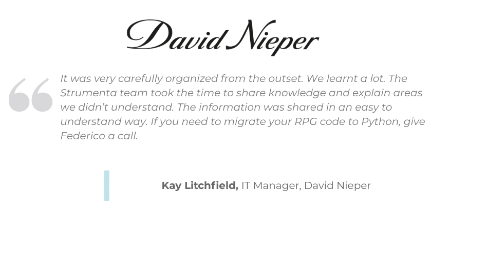 In early 2025, after a Google search, Kaye Litchfield, IT Manager at David Nieper realised that not many companies could help her with this migration. In fact, she found that Strumenta was the only company that could help her automate a migration from RPG to Python. She approached Strumenta who recommended its Migration Blueprint service.